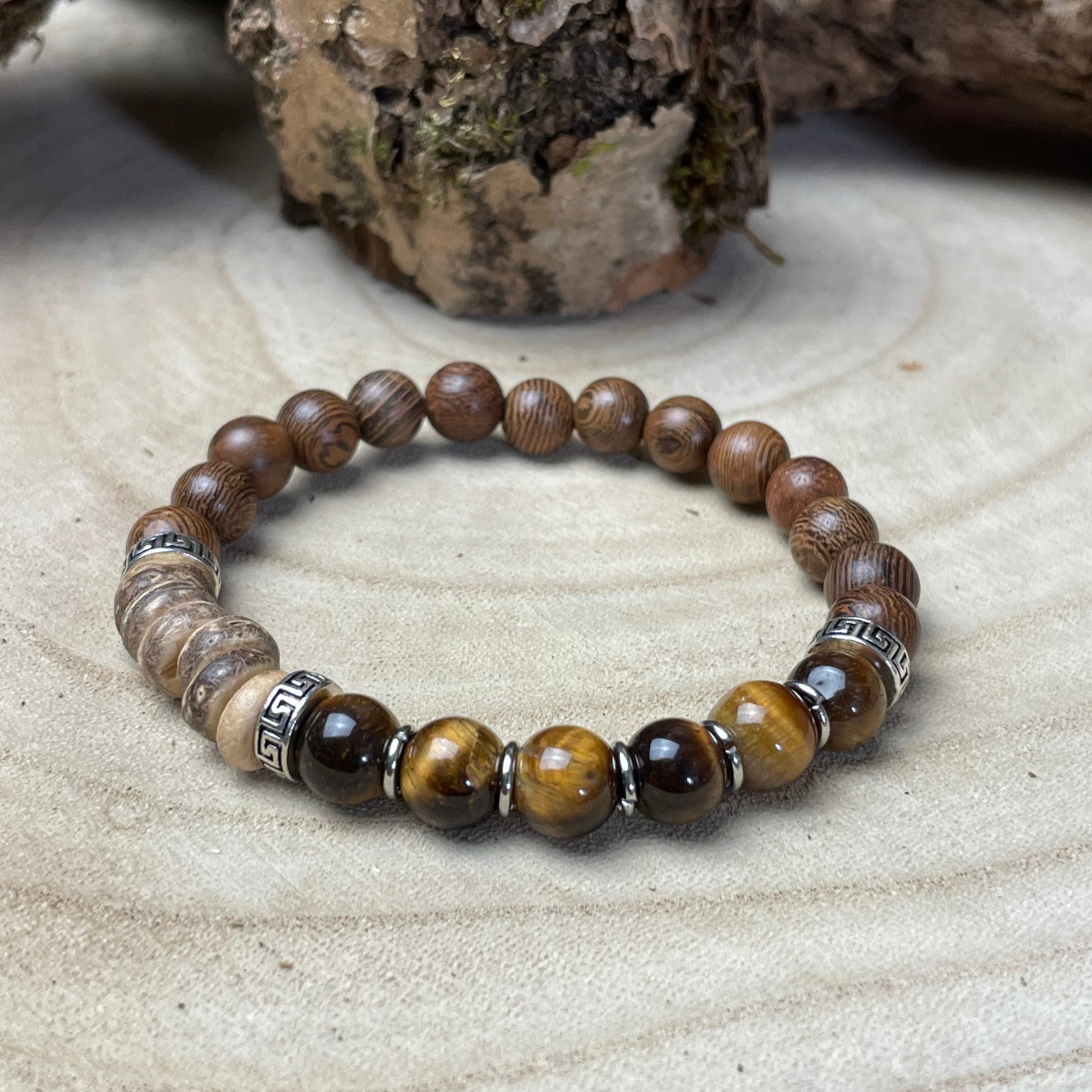 Composé d’œil de tigre, pierre de force mentale, et associé à deux bois puissants — le chêne robuste et le frêne clair — ce bijou est pensé pour l’homme qui avance sans douter, qui ose s’affirmer, et qui reste fidèle à lui-même.